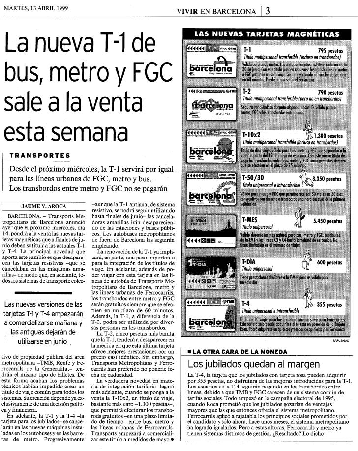 Y el 14 de abril del 1999 TMB puso a la venta las nuevas tarjetas magnéticas T-1 y T-4 que debían substituir a sus viejas hermanas de cartón (o tambien llamadas resistivas) que se cancelaban en las máquinas amarillas. De este modo, en adelante, todos los sistemas de transporte colectivo de propiedad pública del área metropolitana -TMB, Renfe y FGC- tendrían el mismo tipo de billetes. De esta forma se acababa los problemas técnicos que habían impedido crear un título de viaje común para todos los sistemas. Las antiguas T-1 y T-4 resistivas mantuvieron su validez hasta el día 31 de mayo de 1999 y a partir de esa fecha se fueron retirando las canceladoras amarillas de la estaciones de metro y de los autobuses. Aunque los autobuses metropolitanos de fuera de Barcelona, aún las seguían empleando. La primera T-1 magnética costaba 795 pesetas (4,77 euros al cambio). Una de las grandes novedades de la nueva T-1 magnética fue que permitía realizar transbordos gratuitos entre el metro y Ferrocarrils de la Generalitat durante un tiempo máximo de 60 minutos. La T-4, por contra, aun no permitia el transbordo gratuito debido a que las dos compañías de transportes (TMB y FGC) carecían de un sistema común de tarifas sociales. Los conductores de Transportes de Barcelona, declararon en un principio la guerra a los nuevos billetes y tarjetas magnéticas. El comité de empresa decidió por unaminidad convocar una huelga en los primeros días de mayo de 1999. Consideraban que las tareas añadidas que deberían realizar a raiz de la implantación de estos nuevos títulos implicarían más trabajo, más responsabilidad y más estress. La venta de billetes sencillos hasta entonces se hacía sacándolo de un taco de billetes, ahora tenían que crearlos desde un pupitre. Además el nuevo sistema obligaba al conductor a dar un recambio de cualquier título magnético que se averie. Tenían que llevar un paquete de 100 tarjetas capaces de sustituir a los 17 títulos diferentes. Aunque la huelga al final no se realizó. El 1 de julio de 1999, desapareció la tarjeta T-2, porque la nueva T-1 magnética permetía tener las mismas prestaciones que la T-2, poder realizar el transbordo entre metro y FGC, aunque la pérdida de la T-2 provocó un encarecimiento del viaje, ya que la T-1 magnetica resultaba ser 5 pesetas más cara que la T-2. Pero la T-1 magnética permitía ser utilizada por más de una persona en los transbordos, cosa que la T-2 magnética aunque fuera multipersonal, era unipersonal en los transbordos. También apareció en 1999, el 19 de mayo concretamente, la tarjeta T-10x2: una tarjeta magnética con la misma idea que la tarjeta T-3, en la que era válida para realizar 10 viajes en autobus combinado con 10 viajes de Metro o FGC (no con autobús) siempre y cuando el transbordo se realizara durante los 75 minutos posteriores a la primera validación, su primer precio fue de 1300 ptas. Estos cálculos de tiempo entre transbordos (T-1 y T-10x2) fue la principal novedad de la tarjetas magnéticas. Ahora con la tarjeta magnética se podía grabar y guardar la información en la tarjeta de cuando el usuario había realizado su último trayecto y poder calcular si era gratuito el transbordo. Fue el primer paso hacía la integración tarifaria que tenemos en nuestros dias, con los cálculos de transbordos segun sean las zonas en las que nos desplacemos.